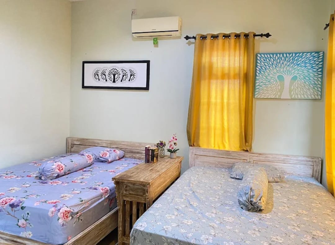 - A fully equipped shared bedroom featuring air conditioning, air purifiers, purified bottled water, a dispenser, two separated Queen-sized beds with bed covers, pillows, bolsters, blankets,